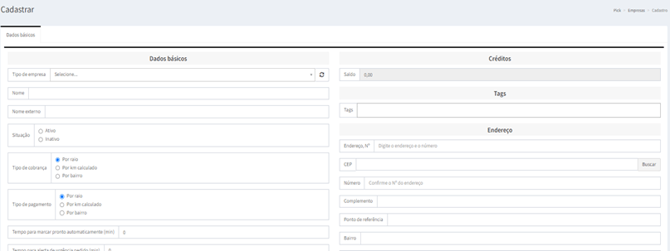 Essa é a tela de cadastro de empresa, lembrando que quanto mais informações melhor! Serão usadas para orientar os entregadores, facilitar a cobrança e pagamento, emissão de recibos e nota fiscal.