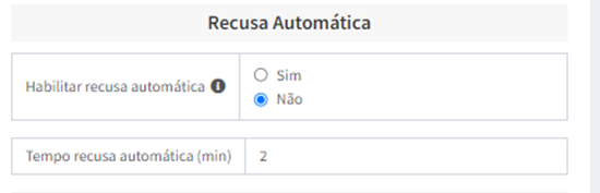 Quando definido o tempo como no exemplo ao lado que está em 2 minutos e ativamos a função, significa que todos os pedidos encaminhados pelo despacho automático se não aceitos em 2 minutos serão redirecionados a outros entregadores. |
