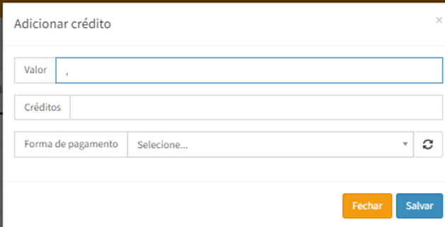 Para adicionar você clica em adicionar créditos e insere o valor pago e a quantidade de créditos que será inserido para a empresa e abaixo a forma de pagamento.