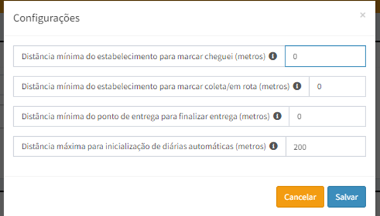 Configurando essa distância mínima do estabelecimento, automaticamente quando o entregador chegar na distância X configurada o sistema irá iniciar a diária cadastrada. |