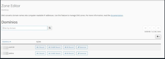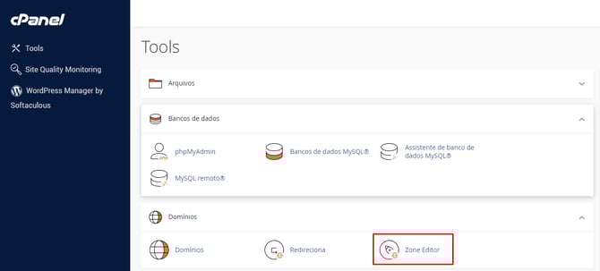 Na tela do cPanel, localize a aba Domínios e clique em "Zone Editor"