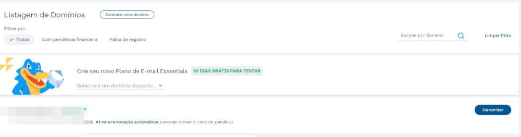 Localize o dominio desejado e clique em "Gerenciar"