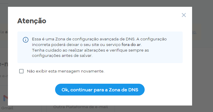 Role até o final da pagina e clique em "Mostrar configuração manual de zona de DNS e clique em OK no alerta.