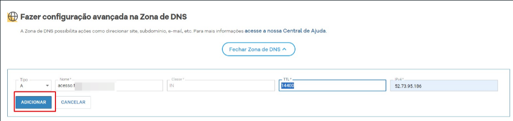 Após preencher, clique em "ADICIONAR" e pronto, seu dominio já está configurado, basta avisar a nossa equipe que seguiremos com a configuração.